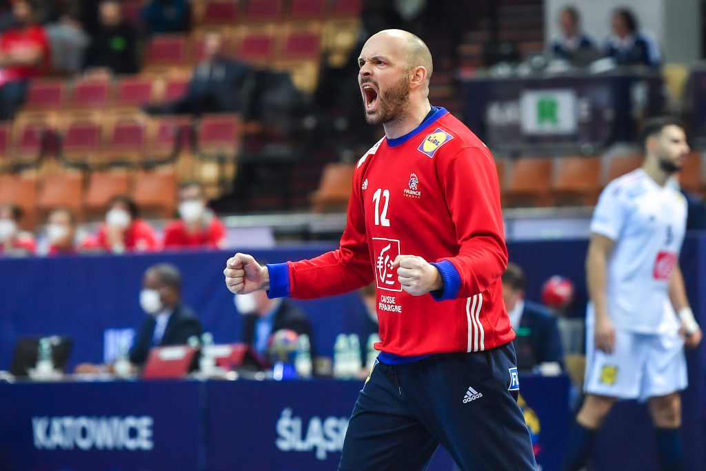 25. 4. 2023 – Český brankář Tomáš Mrkva vyhlíží příchod nového parťáka do brány. Vincent Gérard patří k nejlepším brankářům světové házené.