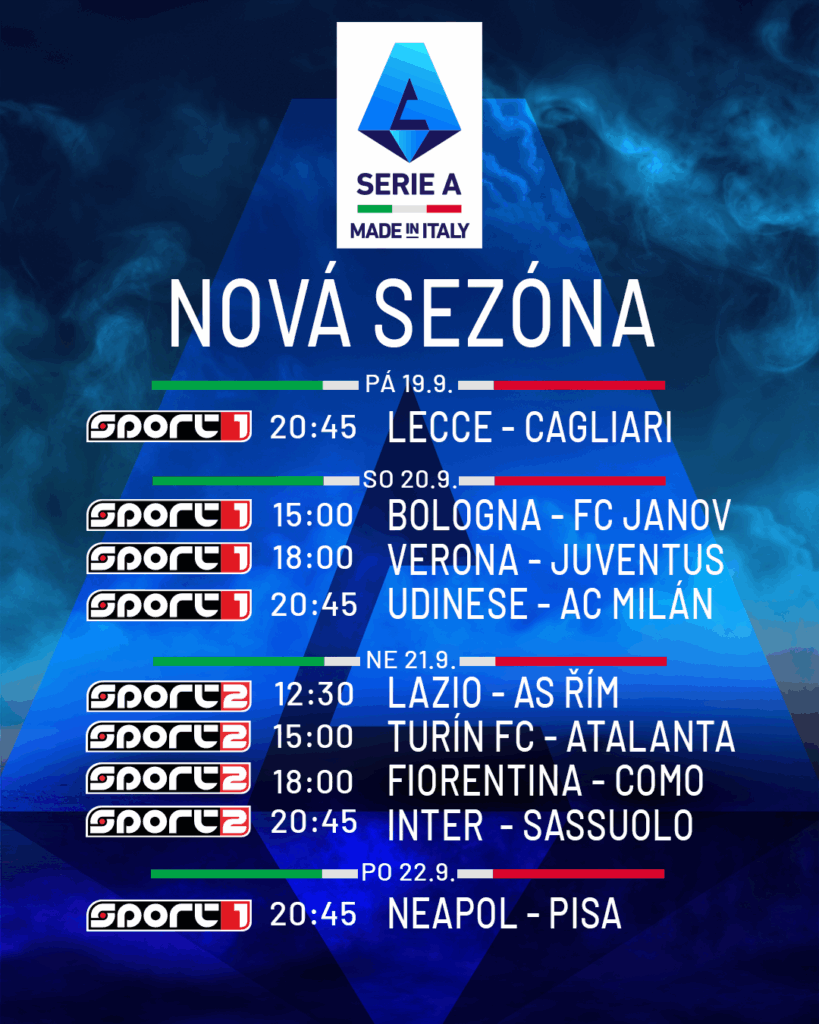 17. 9. 2025 – Sezóna italské nejvyšší fotbalové soutěže nabírá obrátky a tento víkend se můžete těšit na atraktivní duely již čtvrtého kola na Sport1 a Sport2.