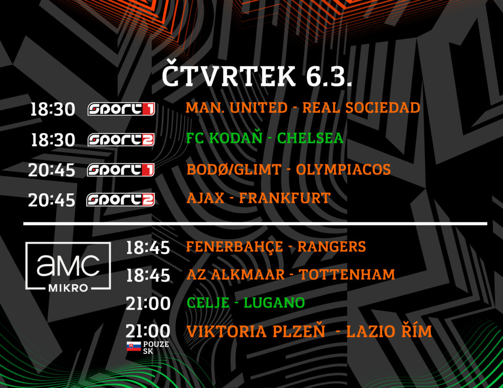6. 3. 2025 – Evropské fotbalové čtvrtky pokračují na Sport1, Sport2 a AMC Mikro velmi atraktivními boji i dnes. Evropská i Konferenční liga UEFA mají na programu první zápasy osmifinále a nás tak čekají špičkové přímé přenosy v tradičních časech.
