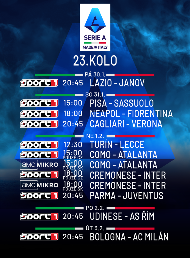 1. 2. 2026 – Atraktivní duely 23. kola nabízí tento víkend italské Serie A. Sledujte přímé přenosy na Sport1, Sport2 a AMC Mikro.