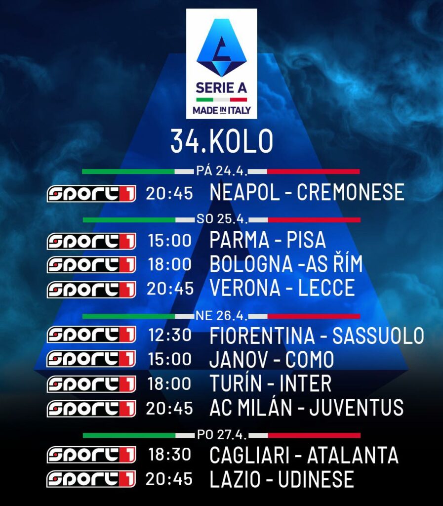 24. 4. 2026 – Sezóna italské Serie A se blíží k závěru a 34. kolo nabízí řadu skvělých zápasů včetně nedělního šlágru mezi AC Milán a Juventusem. Sledujte živě na Sport1 a Sport2